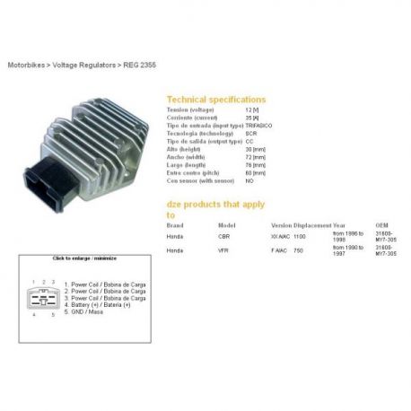 DZE, regulator napětí, Honda CBR1100XX 96-98, VFR750F 90-97 (35A) (31600-MY7-305) (ESR580 ESR587,RGU-107 CL691-12) - nahrazuje 2