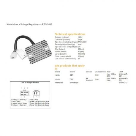 DZE, regulator napětí, Honda CBR1100XX 99-00 (31600-MAT-E01) (SH579C-12) (ESR684)