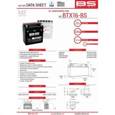 BS, akumulátor BTX16-BS (YTX16-BS) 12V 14AH 152X88X161, bezúdržbový - elektrolyt samostatně (230A) (4) UE2019/1148